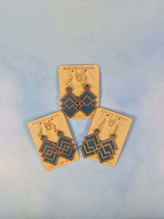 Geometric Wood Veneer & Leatherette Earrings, Brown and Teal Blue 2 Layer Dangle