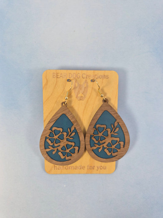 Blue Wood Veneer & Leatherette Teardrop Dangle Earrings, Violet Floral Drop Earring