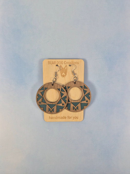 Geometric Wood Veneer & Leatherette Circle Cutout Earrings, Brown and Teal Blue Aztec 2 Layer Dangle