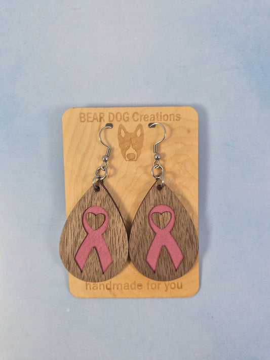 Breast Cancer Walnut Wood Veneer & Leatherette Earrings, Two Layer Pink Ribbon Dangle