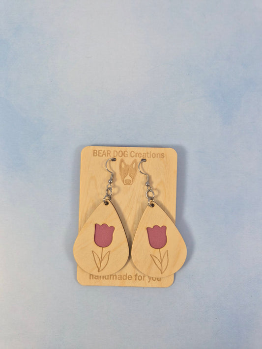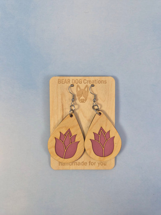 Tulip Light Wood Veneer & Leatherette Earrings, Two Layer Pink Flower Dangle
