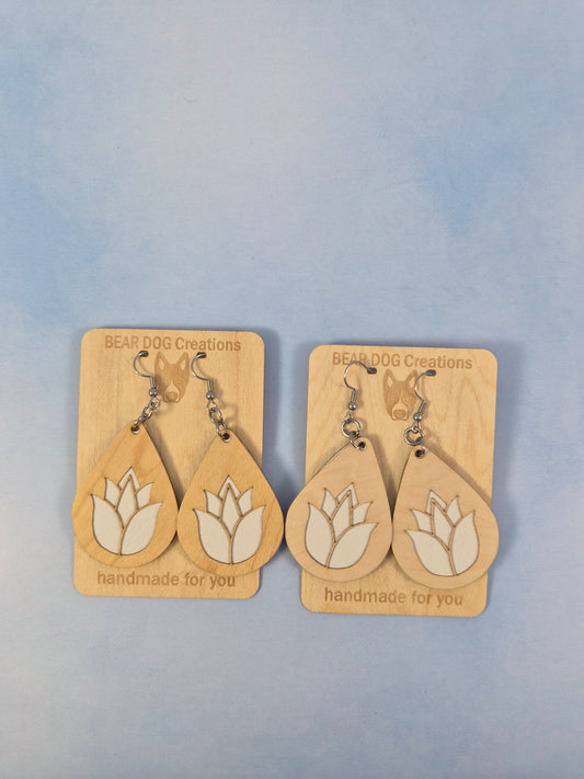 Tulip light Wood Veneer & Leatherette Earrings, Two Layer White Flower Dangle