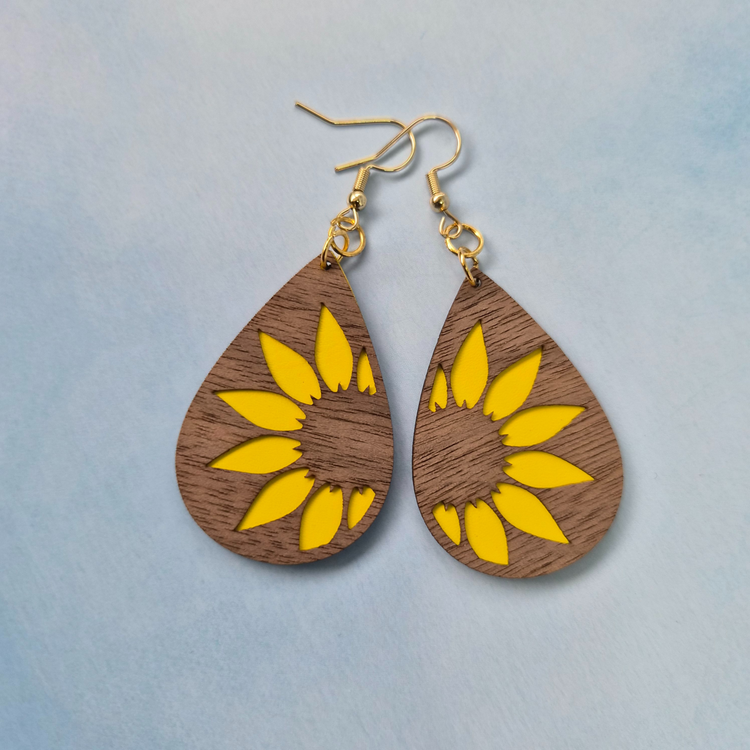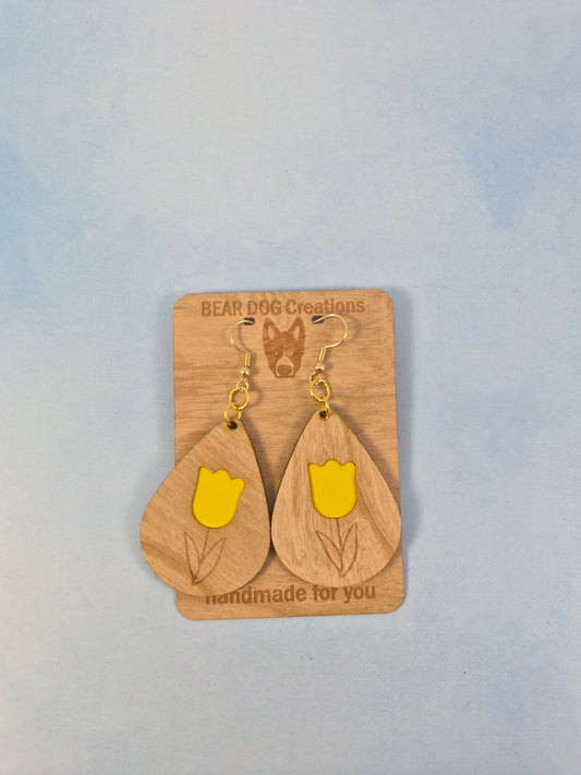 Tulip Brown Wood Veneer & Leatherette Earrings, Two Layer Yellow Flower Dangle