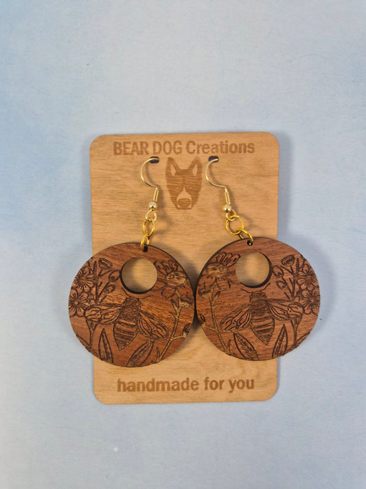 Wood Bee Circle Cutout Earrings, Round Floral Engraved Wood Dangle