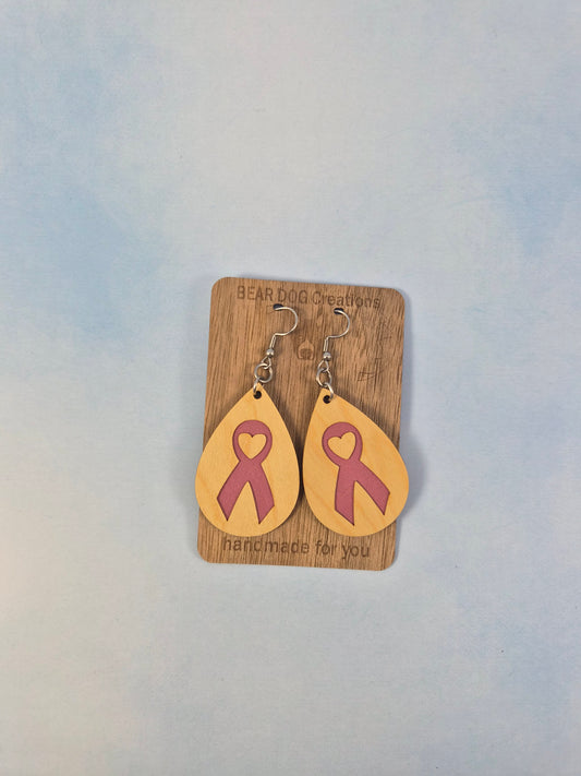 Breast Cancer Light Wood Veneer & Leatherette Earrings, Two Layer Pink Ribbon Dangle