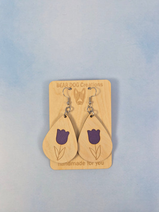 Tulip Light Wood Veneer & Leatherette Earrings, Two Layer Purple Flower Dangle