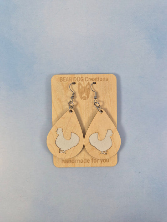 Chicken Light Wood Veneer & Leatherette Earrings, Two Layer White Animal Dangle