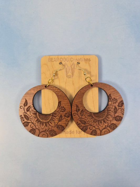 Wood Sunflower Circle Cutout Earrings, Large Round Flower Engraved Wood Dangle
