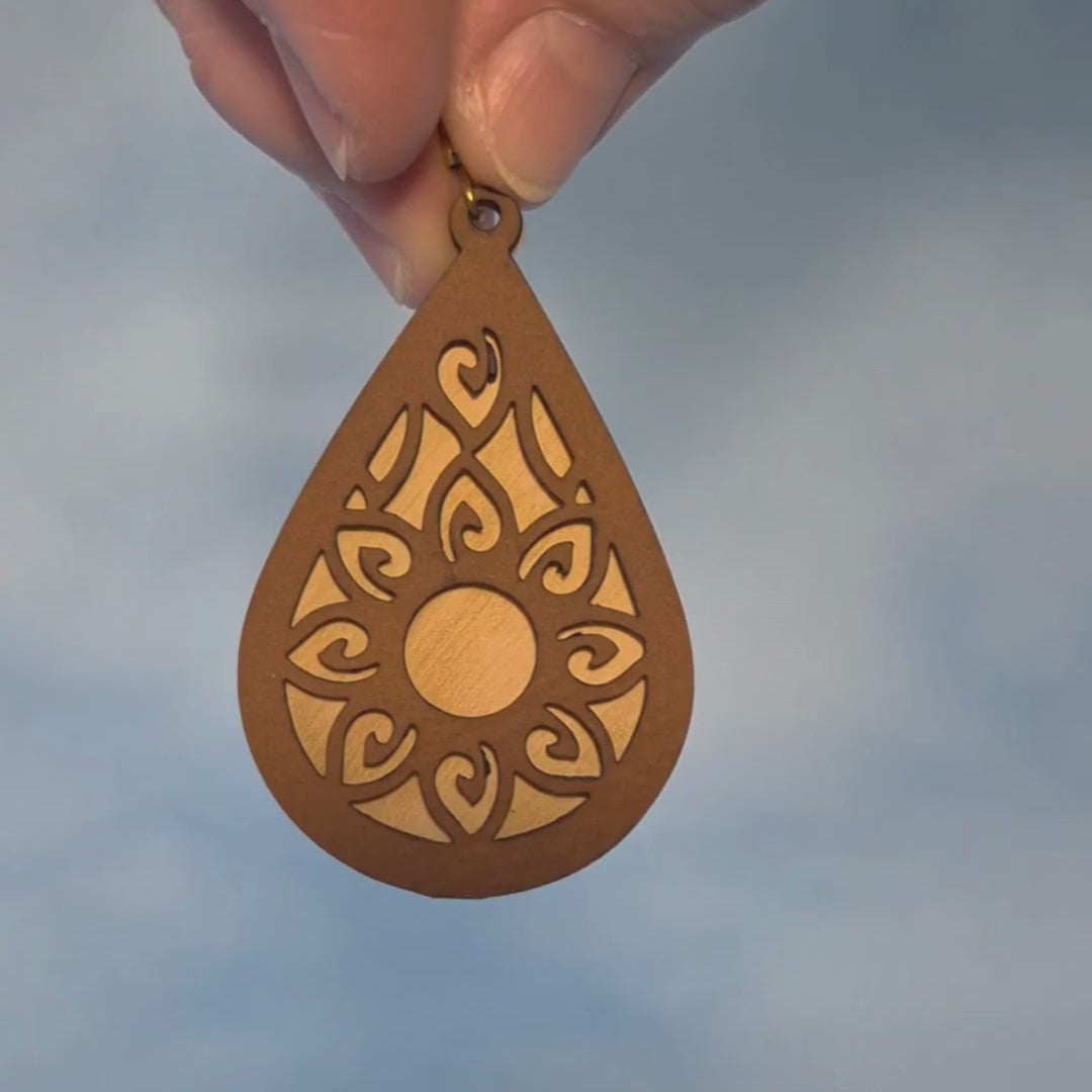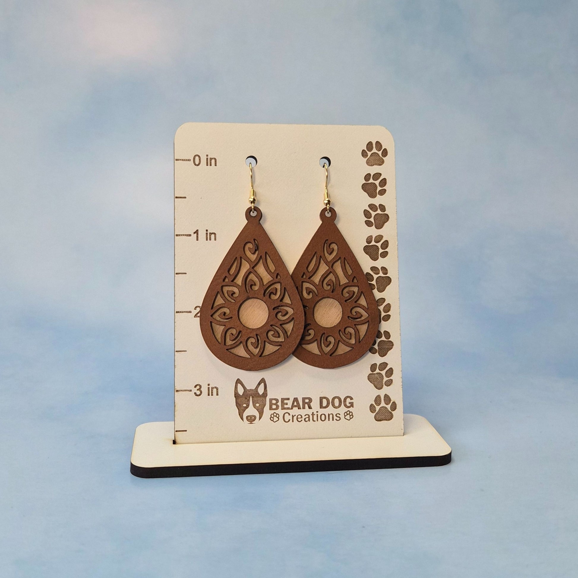Mandala Dark Brown Leatherette (top) Light Wood Veneer (bottom) Teardrop Earrings