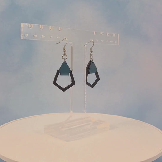 Small Polygon Black Painted Wood and Blue Leatherette Dangle Earring